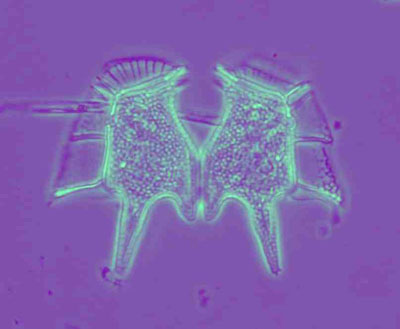 Figure 5: The Siamese twin from the sea: the marine dinoflagellate Dinophysis caudatum. From the Irish SW coast. Colour phase contrast, Wild 10/0.4 Fluotar.