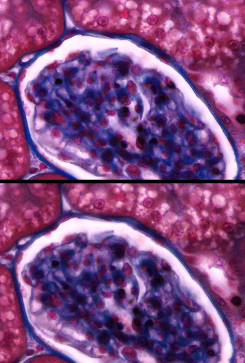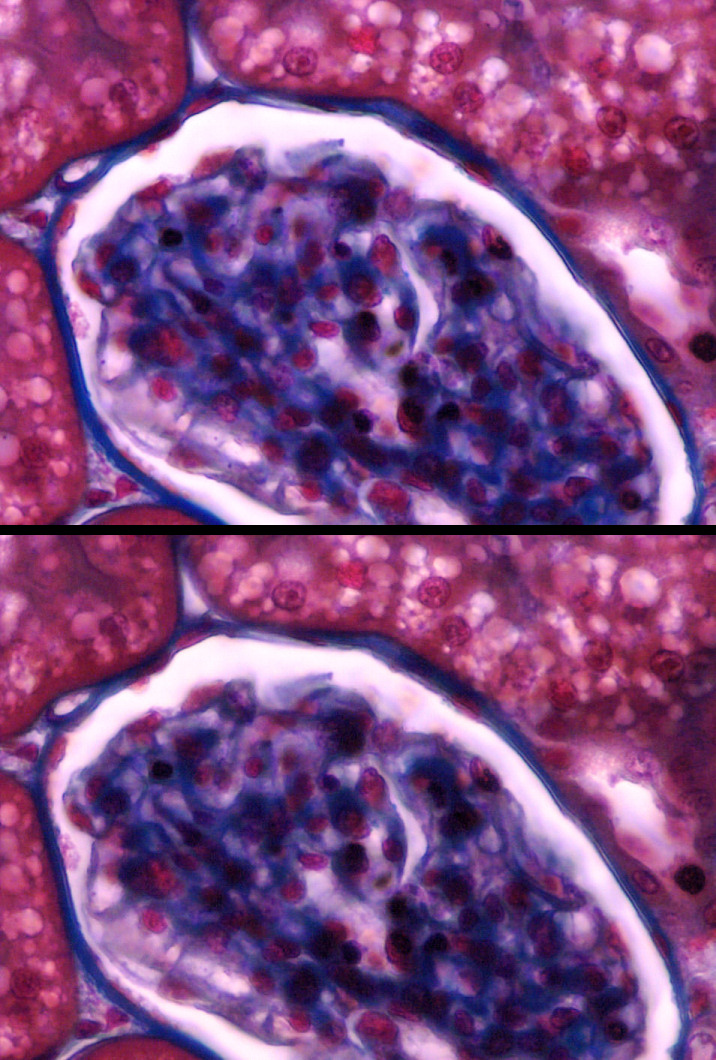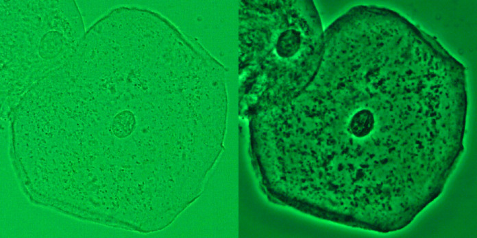 From the above data, it is perfectly obvious that the use of phase contrast illumination is rather pointless for looking at specimens that offer sufficient contrast in brightfield when trying to maximize contrast as well as resolution. While DF and COL offer at least the same resolution, phase contrast limits the resolution due to the condenser annulus. However, this changes dramatically if the specimen is flat and appears rather transparent in brightfield. While DF and COL often offer enough contrast, BF is not of much help. The picture below shows an epithelial cell in BF using a Plan Fluor 40x lens (NA 0.75) (left) and with phase contrast using a DL Plan Achromat 40x (NA 0.65) (right). A green interference filter is used for both images.