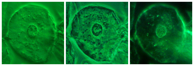 When using COL and DF, much more contrast can be obtained as can be seen in the picture below. The first image shows an epithelial cell in COL using a Plan Fluor 40x objective (NA 0.75); the second one shows the same cell with phase contrast illumination using a DL Plan Achromat 40x (NA 0.65); and the third image shows again the same cell in DF using a DL Plan Achromat 40x (NA 0.65). A green interference filter is used for all cases.