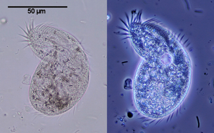 Phase contrast is most ideal for this application of thin, transparent samples such as epithelial cells. - When looking at the pictures above, some of the cellular features appear dark in front of a brighter background when observed in PC. This is usually the case when the S-wave is phase shifted by +90° (known as positive phase contrast). Essentially, objects with a higher refractive index than the surrounding medium appear dark (assuming, of course, the same thickness). - Lipid droplets and vacuoles in plant cells and protozoa usually appear brighter in the surrounding cytoplasm when observed with positive phase contrast. When looking at the images in phase contrast depicted above, we can also easily find certain image artifacts due to the effects of halo and shade-off. Halos occur because the ring in the phase plate ("located" in the back focal plane of the objective) also receives some diffracted light from the specimen. To alleviate this problem, the phase plate annulus (or its image) is wider than the condenser annulus when both are observed with a phase centering telescope. Shade-off, another optical effect, is more obvious in extended phase objects. Phase contrast illumination is recommended by many microscopists for the study of protists (for instance, see [4]). - Many interesting articles have been published in the Micscape Magazine about this contrast method (for example, see [5-10]). |