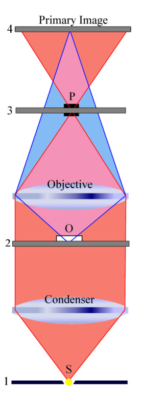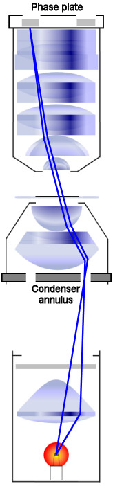 The topic of phase contrast microscopy is well explained in good textbooks and on many websites (such as [1]). The purpose of this paper is not to write another introduction to phase contrast illumination. This article shall merely be about some of my experiences I collected using this interesting type of illumination. Phase contrast microscopy was invented in 1934 by Dutch physicist Frits (Frederik) Zernike (1888 - 1966). The main aspect of this invention is to convert phase differences into amplitude variations that can easily be detected. For instance, phase contrast (PC) microscopy can be used to produce high-contrast images of transparent specimens, such as living epithelial cells. It is an interference technique that requires at least partially coherent light to illuminate the specimen (more precisely, partial, longitudinal coherence is required to make PC work). The numerical aperture (NA) of the condenser is reduced by the geometrical arrangement of the annular ring. However, this reduction in the condenser's NA does in no way diminish the benefit of phase contrast illumination for transparent specimens that mainly change the phase of the diffracted light beam rather than its amplitude. |