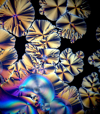 Stereo microscopes may be more suitable for larger specimens than a high-magnification compound microscope. I found that some of the larger clusters of chemical crystals offer pictorial images of great beauty when cross-polarized. Shown below are cross-polarized images of Ascorbic Acid: