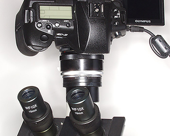 The camera mount is custom-made from old Nikon and Pentax extension tubes. I have found that every time I fabricate a microscope camera mount I am starting from scratch. I recommend that anytime you see used extension tubes in a camera shop, snap them up. They are very handy to have around for building camera adapters. The eyepiece is an Olympus 2.5x photo eyepiece.