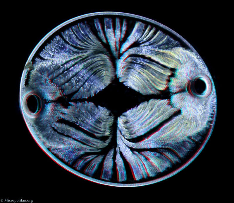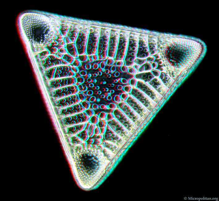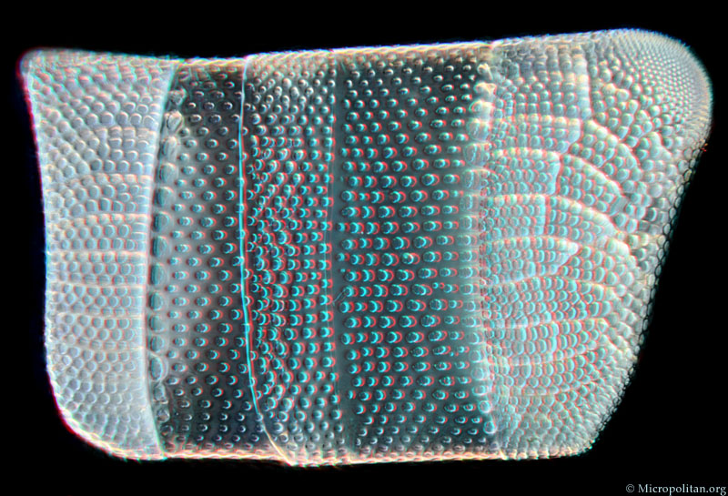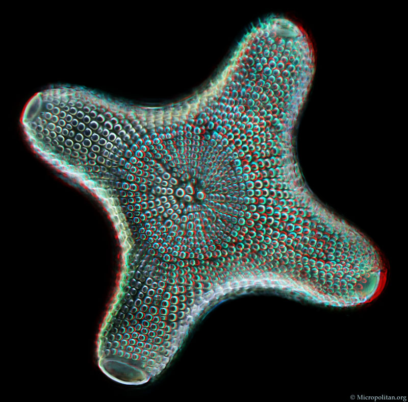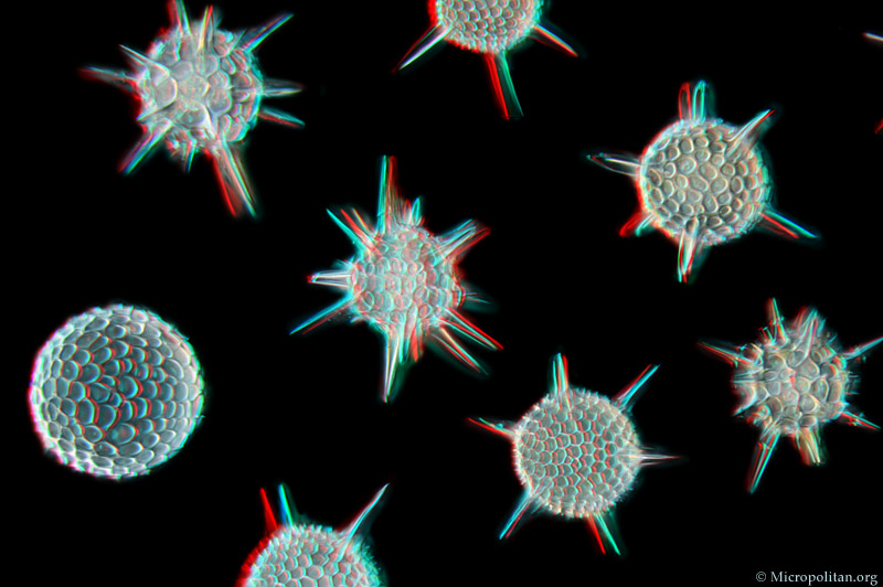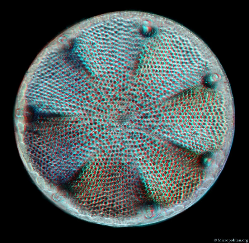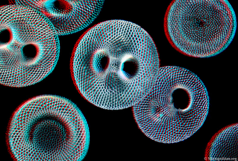 The following images were made from mounted slides I made of fossil diatoms from Barbados, and radiolarians from the same location. The objective used was 16X.The images on this page are presented as red and blue anaglyphs and they have to be seen with special glasses. But in case you don't have these please go to the cross-eyed stereo version of this page. |