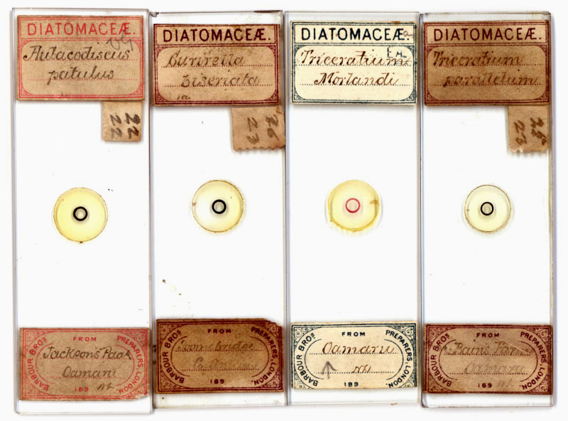 Figure 1. Four slides by the Barbour Brothers. Specimens are 1 to 4 precisely-located diatoms of the indicated species. The lower labels were pre-printed “189”, indicating production during the 1890s. The three different colors of printers’ ink suggest several orders for labels and an extended production run for the Barbours’ slides.