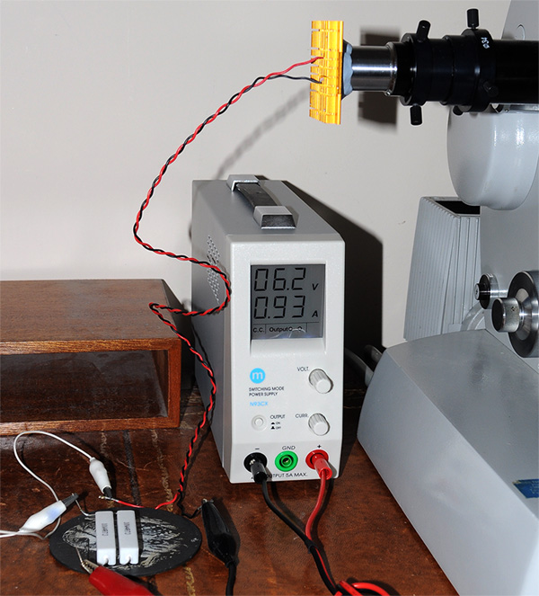 Right: The electrical setup for safe trials of high power LEDs with differing current requirements. The maker's data sheets describe recommended voltages / currents. The compact switched mode power supply, although not bought for the purpose, is very useful for trials, as can be set to constant current or voltage. (Although this supply is overkill, a variety of cheap variable or fixed V/I PSU options are now available for LEDs.) The variable voltage allows the light intensity to be increased as well as monitoring the LED V/I so as to keep within its specifications. The 'soft' on/off for power is also handy. Unlike mercury / xenon lamps, LEDs are tolerant of such switching (and exploited for multi-colour excitation for example in Zeiss' impressive Colibri LED fluorescence microscope system.) A Philips Luxeon® III Star (5W, 1A, 3.9V, 450mW luminous flux) 455nm 'Royal Blue' LED is in use*, shown running at almost its max. current rating. Some of the 6.2V set is dropped across load resistors shown bottom left. These are 2 x 4.7 ohm 10W (70p each from Maplin) in parallel to give a safe load to the supply and LED. Although only ca. 5W is being dissipated, the resistors still get quite warm and sit on a slate disc. *Maker's code LXHL-LR3C, bought from Farnell UK for £5.36 + VAT (although min. total order £30 from this supplier). |