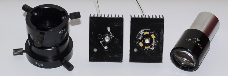 Right above: The same LED inserted into the base of a reversed Zeiss 10X Kpl W eyepiece. By trial and error with optics to hand, this eyepiece focussed the beam to a ca 1 cm spot i.e. the approx. size of relay lens stop, thus improving light efficiency. The eyepiece focussed the LED's emission array in the rear focal plane of an objective in use, suggesting a well set up light system.