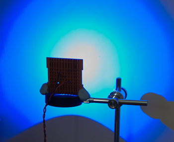 Left above: Power LEDs typically have a Lambertian light emission (160º 'viewing angle' for this example)*; when shone at a wall the same distance away as the LED would be from the fixed relay lens / stop in Zeiss epi tube, there is a central beam but too wide and much light is wasted. (* A 'batwing' and 'side emitter' is also common, but seemed less suited for this application.)