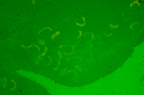 1 x BG12 excitation filter in place. Palate of whelk, Wheeler slide. Good contrast image and very similar to that seen with a 100W halogen or mercury lamp. Leitz 6.3x NA0.2 NPL Fluotar. Exposure ISO200, 2 seconds. |