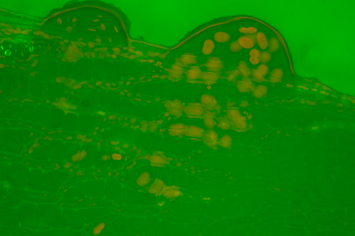 No excitation filter. Silver fern leaf, Gymnogramma peruviana, dry Victorian mount. Zeiss 2.5X planachromatic objective. Exposure ISO 200, 2 secs. A 'green wash' of light is dominant, masking any fluorescence. The dirt is under the coverslip, fluorescence imagery normally suppresses this as it doesn't fluoresce. |