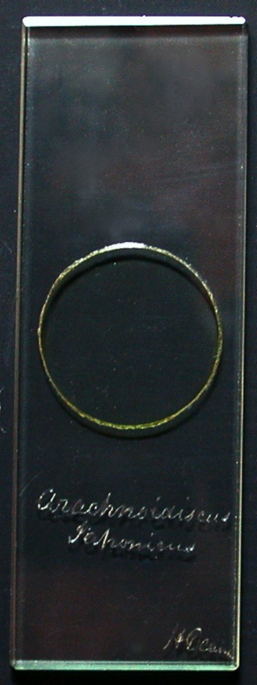 Two slides were of splendid forensic value: they were of fossil foraminifera – xanthidiae (so called) from the lower chalk at Folkestone. In 1845, Henry Deane succeeded in mounting them from samples of Folkestone chalk treated with hydrochloric acid, exciting the interest of the celebrated fossil-hunter Gideon Mantell: the two subsequently collaborated in communication to the Royal Society. Deane’s work was significant, influencing a seminal phase of English palaeontology. Several diatom species bear his name in their nomenclature, furthermore he coined the generic term Arachnodiscus, in a paper (unpublished) read to the Microscopical Society in March 1847. His contributions to pharmaceutical research made their way into standard British textbooks of therapeutics. The slides are of the smaller “standard” dimensions recommended by the Microscopical Society of London in 1839, bear glass cover slips, and use glycerine jelly mountant. Deane became President of the Pharmaceutical Society of England, and evidently made his own slides, taking pride in their presentation: hence his more expensive unpapered bevelled glass, something forsaken by most mounters following the fashion for papering, which covered up less expensive unfinished glass. Remarkably, at this distance in time, ink inscriptions on the back of the slides have survived, reading “Dr. Lee”. This may refer to Deane’s contemporary the geologist J.E. Lee. Alternatively, the slides may have found their way into the collection of Arthur Bolles Lee, the well known writer on microscopical preparation: the two slides below certainly ended up in a collection of some sort, as evidenced by their numbered labels.