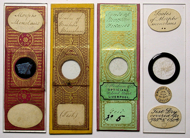 Essentially, prepared slides of the scale strews labelled 'Menelaus' or 'Morpho menelaus' inspected, dated ca. 1830s - ca. 1860, do match the contemporary descriptions and illustrations of the test object scales but do not match those of the modern M. menelaus. However, slides of sections of the upper wing prepared at the same time by the same maker do have the very different scales typical of the modern M. menelaus. This suggests that this mismatch was something more than an early 19th century understanding of the Morpho genus differing from our current classification. (Another famous test object, the scales of the springtail 'Podura' identified at a similar date to 'Menelaus' were the subject of taxonomic uncertainties for some decades as to which species was being referred to, see the Micscape article by David Walker.)