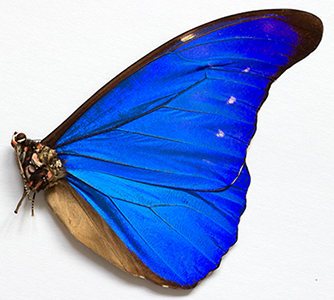 'Quantified interference and diffraction in single Morpho butterfly scales', by P Vukusic, J R Shambles, C R Lawrence and R J Wootton, Proc. Roy. Soc. Lond. B, 1999, 266, 1403-1411.