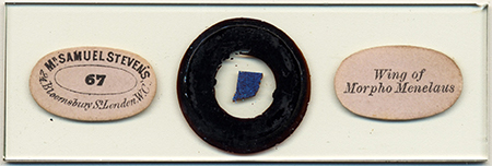 The Morpho butterfly was a popular permanent microscope slide subject from the 1830s through to the 20th century presenting either a fragment of the upper wing or strew of the scales. My own late 19th century example of a strew by Wheeler is shown in the header. I am indebted to Brian Stevenson and Howard Lynk for the images of their own examples shown below. Only the earliest example of a slide pair owned by Howard are shown here,