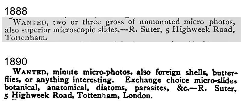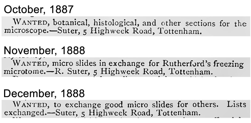The earliest known microscope-related exchange offers from Richard Suter. The 1887 request appears to request unmounted material. The November 1888 offer was probably a request to obtain a microtome, which would be essential for a slide-maker, although it is possible that he wanted pre-made slides in exchange for a surplus microtome. It is clear that, by December, 1888, Suter was making slides available for exchange.