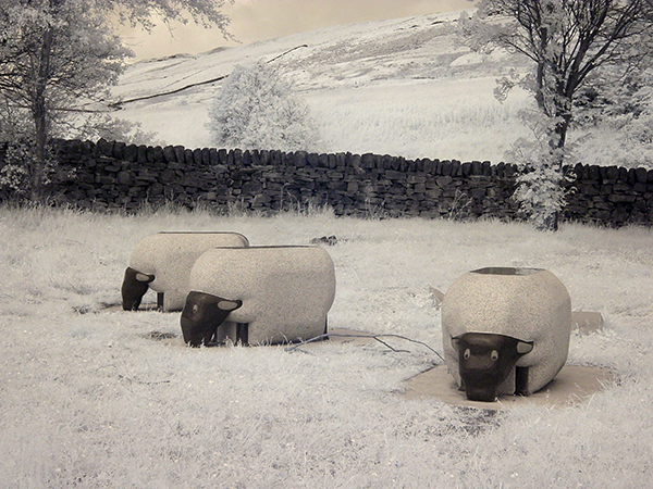 The photographs shown were all taken in colour but to remove the red tint of NIR photos, the white balance was manually corrected by pointing at grass which is white in NIR. This leaves a pleasing sepia tint in some skies and hasn't been added.