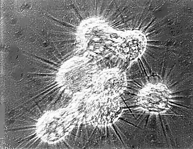 I kept this image and present it here, because of the organism which is quite unusual, and I found it only once in a highly alkaline lake in the high prairie (about 7,000 feet). It is a cluster of Amoebae, named Raphidophyrs (although the taxonomists may have changed it by now). These little critters form clusters and create “bridges” with their pseudopodia, apparently as traps to capture prey for feeding–a remarkable example of cooperation at the most basic level. Well, so much for keeping my comments brief but, I promise, I’ll try harder as we proceed. (However, don’t make any bets on my having much success.)
