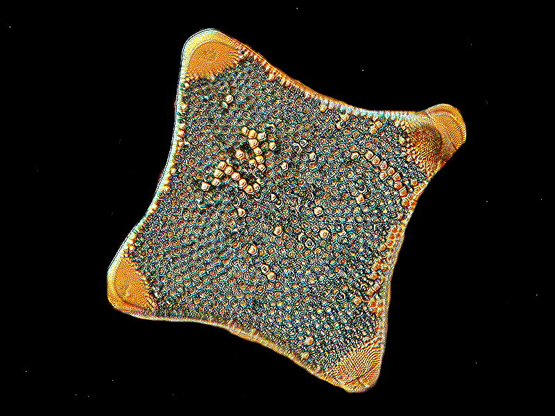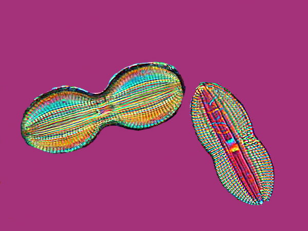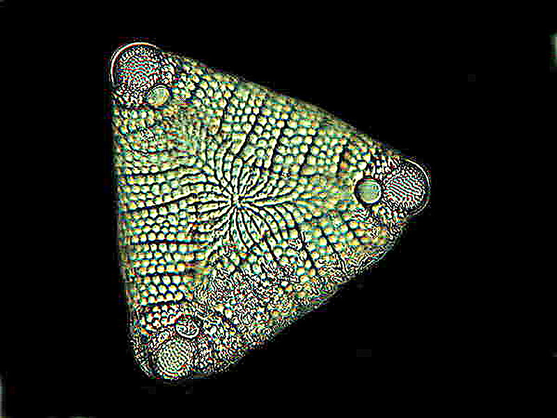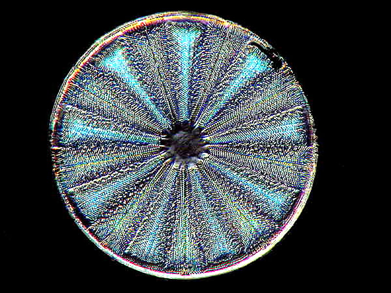 The centric diatoms, because of their radial symmetry are sometimes regarded as more beautiful, but that’s not quite fair. Diatoms are difficult to photograph, because they have so much fine structure. You can demonstrate this for yourself by going on Google and looking at SEM (Scanning Electron Microscope) images of diatoms. Further complicating things for the optical microscopist is the fact that the diatom frustule (shell) is largely composed of silica (glass) and creates special challenges to make the details accessible. However, using special contrast techniques such as Nomarski Differential Interference Contrast and adjusting the prisms so as to obtain what is called “optical staining”, one can get some rather spectacular results. I’ll show you another example of a pennate diatom, but this time using Nomarski and then an example of a centric diatom, also using that technique.