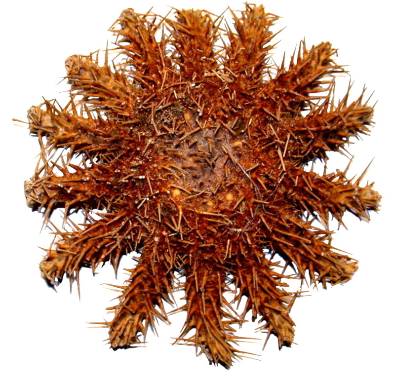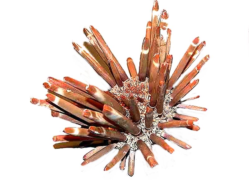 Another large echinoderm is the “slate pencil sea urchin”, Heterocentrotus mamillatus and probably apocrophally, in early days, the spines were used as chalk for writing on slate boards in classrooms. It is a tropical form found in the Indo-Pacific region and does have long, thick spines which have a sort of resemblance to brown sticks of chalk.