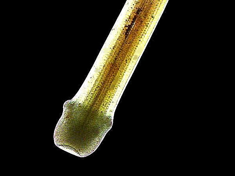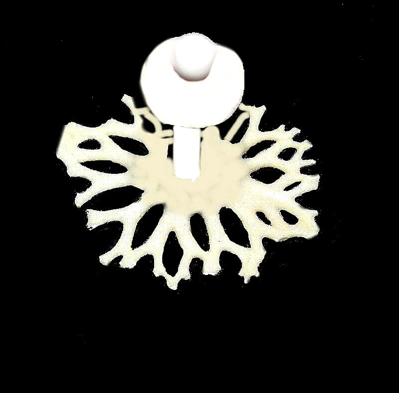 Spines in sea urchins come in all sorts of strange shapes and sizes and here I want to show you one of the most bizarre. It is a spine from a tropical species, Goniocidaris mikado, and I am showing you an upside down view. The ball and collar, which look rather like a tropical sun hat, form the ball portion of the ball and joint apparatus by means of which the spine is attached to the test (shell) of the urchin. This means that the frilly part at the bottom is actually projecting upward when attached.