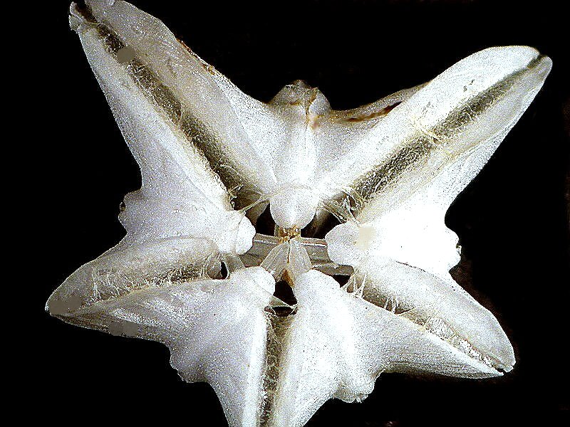 Equally remarkable is the “mouth” structure in sand dollars. This is a view from below and here you can clearly see the five teeth. Throughout the “lanterns”, pentagonal symmetry tends to be preserved.