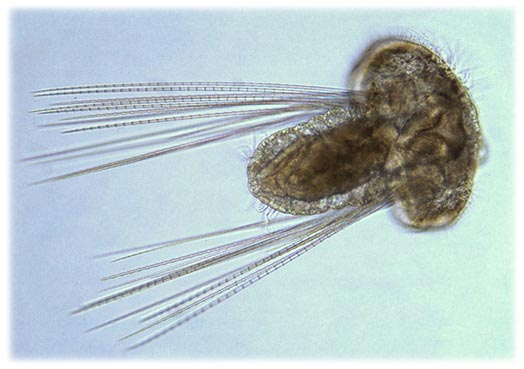 In some species the bristles can grow to considerable size. This could serve as a defence structure against predators. The larva lives free swimming in the plankton. It has a large flat head with cilia. With this it can suck in small food particles. After they become adults they start their lives on the bottom of the sea. Some will live buried in the mud. Many of them build special tubes for protection. Others move around searching for prey. A large group of polychaetes, the tube worms (Serpulidae), live in tubes attached to a substrate. They are beautiful creatures since they develop a large feathery crown of tentacles to capture plankton. But not all bristle worms are so gentle and elegant. The last page will show you there are Polychaetes that are fierce and who will not hesitate to eat members of their own species. |