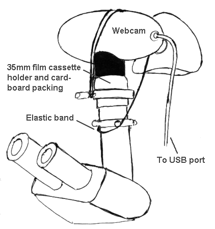 Having got the distance for the camera above the lens sorted out (50 mm), I made a suitable hole in the bottom of a black 35mm film cassette which happens to be 50 mm deep. This with some card and sticky tape wrapped round it fitted nicely into the smallest of my extension tubes, wedged in place with the bottom uppermost, the camera with lens removed was a firm fit in the hole. The weight of the webcam stand pulled it a little to one side but this was corrected with an elastic band. (See sketch below). If I am going to use it permanently on the microscope I could remove the stand.