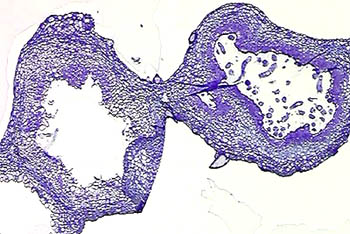 Note that the inner wall of the cavity is formed by densely stained plant cells. The outer wall is made of large and vacuolated plant cells.