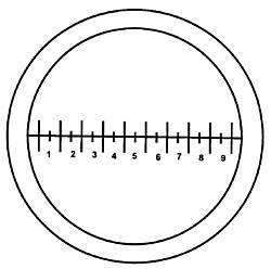 Resizing is a fairly simple two-print process: Measure the inner diameter of your eyepiece field stop, where the reticle rests – let’s assume it measures about 19.3 mm. Print out the attached file onto a transparency sheet (the inner circle is 20 mm wide) and cut out the reticle so that it fits symmetrically into your eyepiece. If your field stop ID is over 20 mm, resize the drawing first so that the inner circle is slightly larger. With this temporary reticle in your eyepiece, count the number of divisions within your full field of view, 19.5 for example. Next, measure your field of view accurately, as illustrated above – let’s assume you have a 100x lens with my field size, i.e., 0.187 mm. You want the final scale to show 18.7 divisions within this field, so digitally enlarge the image by 19.5/18.7 = 1.043. Reprint, cut out and insert the final reticle. Now, any object under this lens that fully fills one minor division is exactly 10 microns in size.
