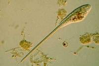 And, of course, there are some organisms which are not so speedy and sometimes one can capture them at moments of considerable interest—amoebas, for example. Below are two images which I find quite intriguing: the first (Amoeba_alga1624) shows a fairly small amoeba ingesting a piece of a filamentous alga giving the odd appearance of feeding through a long straw and the second (Amoeba_diatom1596) shows a different species of amoeba enjoying a feast of diatoms.