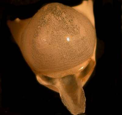 Some of the larger forams are a particularly good specimen type to begin with; because they are so elegant, they provide an incentive as well as a challenge, to capture high quality images. Feathers, sections of butterfly wings, insect parts, crystals, seeds, echinoderms spines and plates, bits of plant leaves, flower petals—the list goes on and on—are all suitable objects for photographing. Below are 2 images taken through a Stereo microscope; the first is a quite elegant foram which rather reminds me of a piece of sculpture by Henry Moore and the second, which looks quite sinister like some sort of strange skull, is actually the shell of a fossil pteropod or “sea butterfly”.