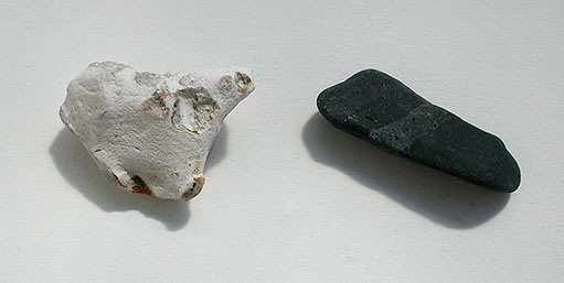 Chert, (flint), a form of chalcedony, and a fragment of some of the most ancient rocks in Jersey, Brioverian shale, collected in St. Ouen's Bay.