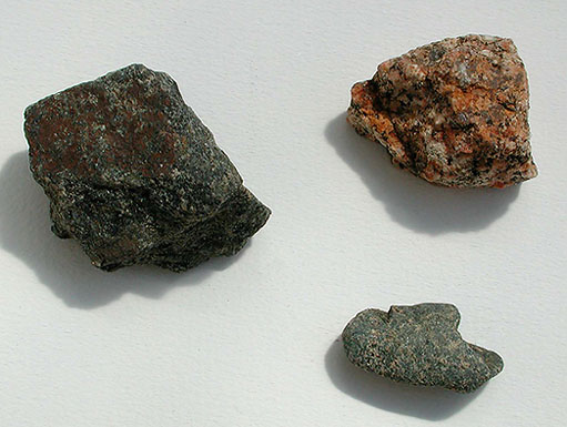 Granite-type rocks from the area. At upper right is a granite with the characteristic pinkish colour given by orthoclase feldspar. The rock at left is probably diorite, a mixture of granite and gabbro, a darker and more basic igneous rock. The smaller fragment at lower right is possibly intermediate between the two.