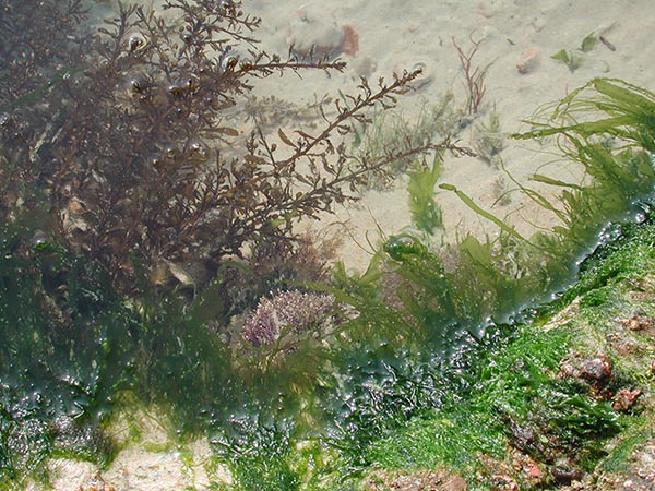 A tidal pool in St. Brelade's Bay, host to a variety of different seaweeds. Upper left: Sargassum muticum; bottom, right: Ulva lactuca, covering Corallina officinalis near middle of picture.