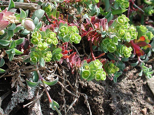 Euphorbia portlandica, Portland Spurge, with Silene vulgaris ssp. maritima , Sea Campion, towards the upper left of the picture.