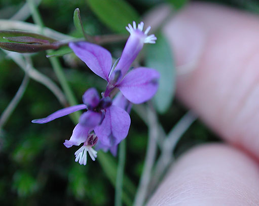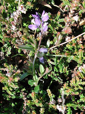 Polygala serpyllifolia, Heath Milkwort, a perennial with beautiful tiny blue flowers only just visible among the heather. This is the more usual form but pink, white or paler blue forms can also be found. Up close the flowers can be seen to consist of a tube containing the floral parts, flanked by two flattened perianth segments.