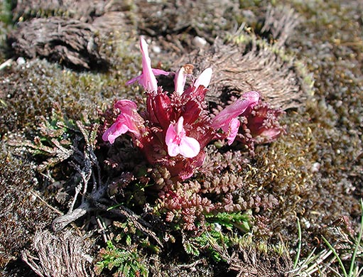 Pedicularis sylvatica, or lousewort, a typical plant of heaths, moor and bog. This was found to be very low-growing, probably only about 5 cm high (although it can grow to 25 cm), and arranged in a squat rosette. Leaves/bracts appear reddish in this photograph but can equally be tinged with yellow-green.