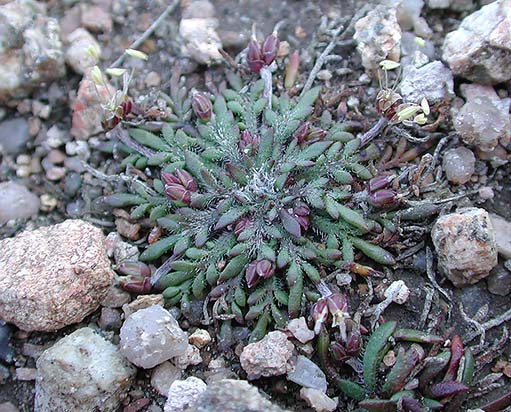 Plantago coronopus, Buck's Horn Plantain, found at Grosnez Point, and easy to miss unless one focuses on the ground! The rosette in this instance was only about 2 cm across; usually the leaves are better developed. Flowers are small and inconspicuous with very dominant floral parts. Up close it can be seen that the leaves are slightly succulent and hairy, an indicator of the plant's preferred habitat of exposed coasts, shingle and cliff-tops.
