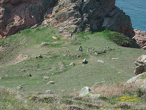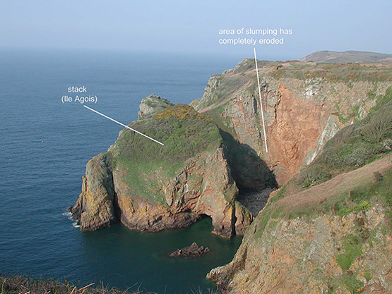 Approximately halfway along this walk is a similar and, it was universally agreed, more picturesque, geological structure. The origins are possibly the same as those at Devil's Hole, with the difference that the “hole” has been enlarged to create a stack, Ile Agois. Presently this is inaccessible, though building foundations and the recovery of Roman and Dark Age coins indicate early settlement.