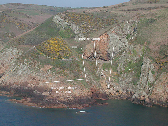 A peculiar geological phenomenon can be viewed by walking approximately 3 miles along the coast from Greve de Lecq beach (or a comparatively shorter distance from Greve de Lecq Vineyard). The phenomenon in question is an area where rock behind the cliff has slumped to form a shaft (hence the name “Devil's Hole”), which has been systematically eroded and eventually connected to the sea through erosion of caves in the cliff on the seaward side.
