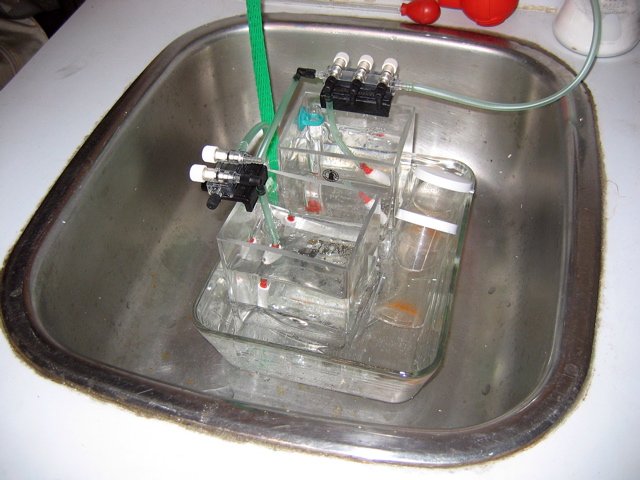 The next problem was to construct a simple, inexpensive and effective chilled salt water mini-aquaria system at home so that I could study larval development with my Zeiss IVb stereo-microscope. My solution was to use 2 Ikea flower vases sitting in a Pyrex oven dish water bath ( photo 3 ) into which a trickle of cold tap water flowed. The mini-aquaria maintain a constant 10C. Sea water temperature at the Vancouver Aquarium was 9.5C at the time. To maintain gentle circulation within the flower vases air was restricted to a flow rate low enough so that you could count the bubbles rising from the air stones.