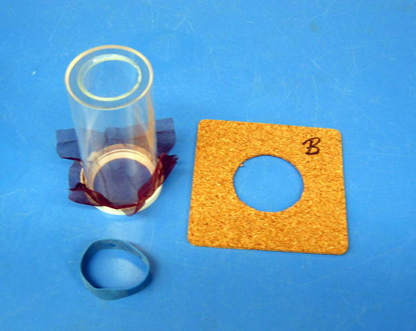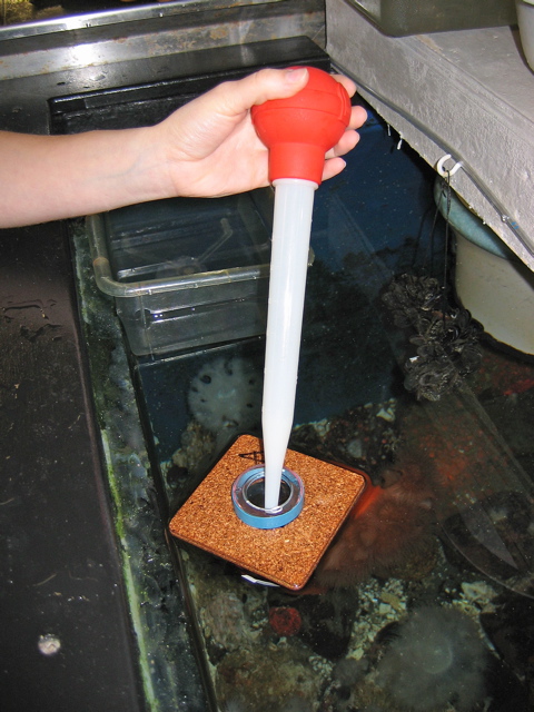 The first problem was collecting the larvae. Since I am only at the Aquarium twice a week I needed a simple, easily taught technique that staff members could use to collect and hold the little "critters" for me. My solution was the "critter corral", a floating concentrating / holding chamber made from a large plastic pill vial, an Ikea cork coaster, an elastic band and small square of cloth mesh ( photo 1). Crab larvae were successfully collected for me using the technique illustrated in photo 2, floating unobtrusively about the surface of the large salt water tank for about a week. The crab larvae were fed fresh Artemia nauplii every day or so by staff members at the Aquarium.