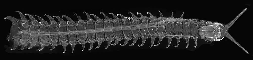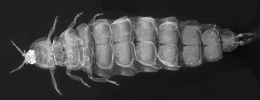This mount also had a very flat tonal range, so after scanning, 'levels' were adjusted before an 'invert' and colour removal to create a pseudo darkfield to highlight the leg structures which are ideally suited for swimming.