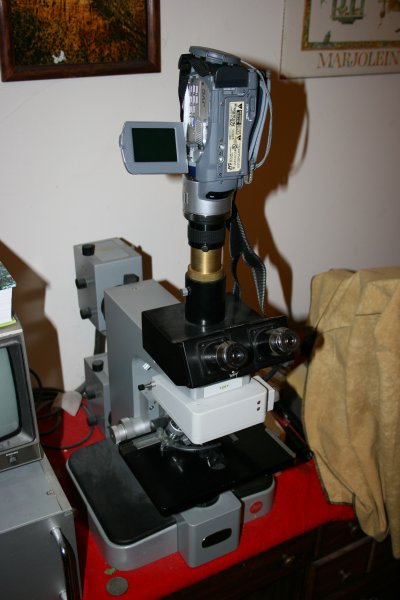 Modern digital video cameras are not the monsters that earlier ones were, in fact, many are less massive than many still digital cameras. Standard consumer digital video cameras have fixed zoom lenses that cannot be removed. This means that when they are attached to a microscope, the image must be obtained through a microscope ocular of some sort. The image to the right of this text shows a Leitz Orthoplan microscope with a digital video camera attached. This particular video camera is larger than average, and it is still dwarfed by the huge Orthoplan microscope!