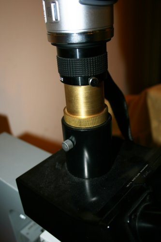 Some trinocular microscopes may have unusual fittings for the "third eye". I machined a special holder that can use both standard eyepieces and the special 30mm ones used by the Leitz Orthoplan. (Simply inverting it changes it from one size to the other.) The image to the left shows a closeup of the attachment point of the microscope to the camera.