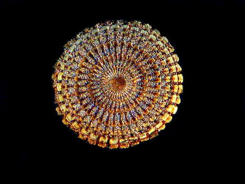 However, when we cross the polars, we get another example of micro-prestidigitation. Once again, I am reminded of a cross section of a sea urchin spine and one of intricate beauty and complexity.