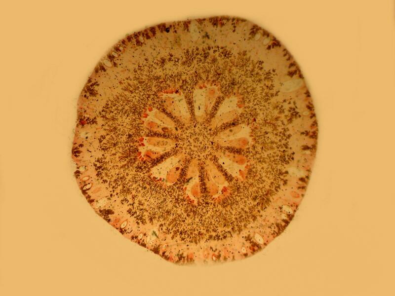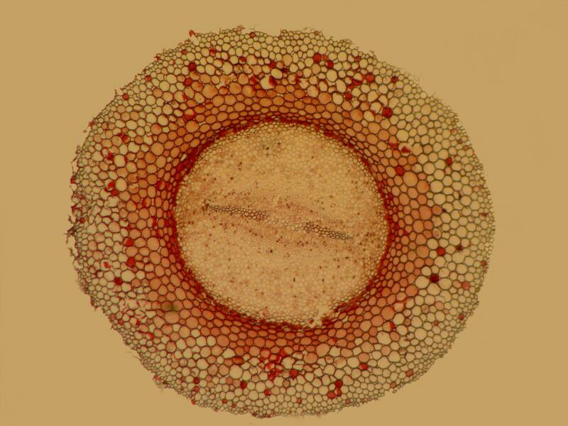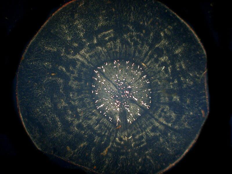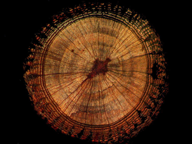 The second comparison involves equally remote realms. First, let’s take a look at a section of a very young Northern White Cedar stem, Thuja occidentalis. Here I’ll show you just one image which was taken using polarized illumination.