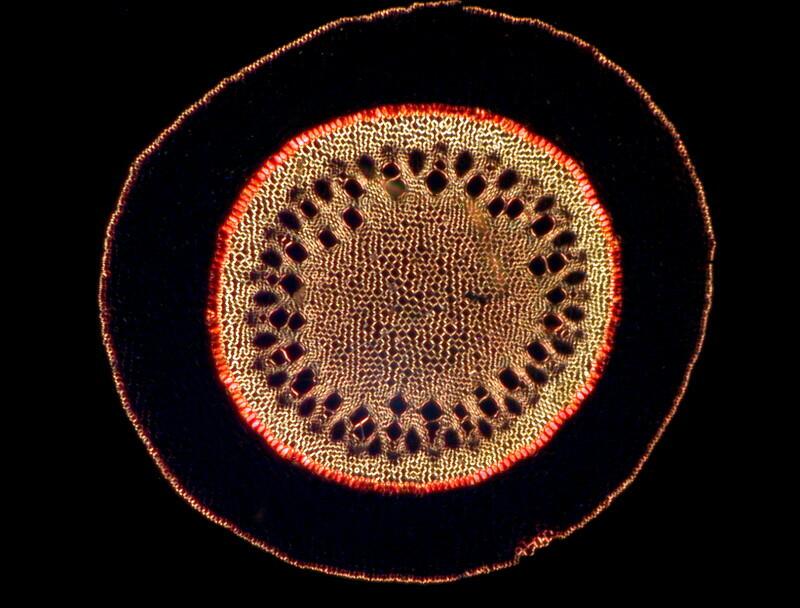 Finally, I’ll show you 3 images of one of my favorites, Ranunculus acris, the tall buttercup. This brilliantly yellow little flower is something to gladden the heart and I find it quite wonderful that a section of its stem reveals a very different kind of symmetry and pattern. The first image is brightfield and while suggestive remains rather pale and hidden.