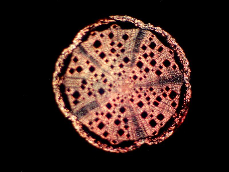 Since somehow, no doubt through the divine inspiration of Queztalcoatl, we have returned to one of my favorite subjects, namely yet another stem section which reminds me of a section of sea urchin spine. Interestingly, this is a section of a stem of a tree, a red oak, Quereus rubra. This is a tricky one to photograph so the first image is what one might describe as semi-polarized, that is, it was taken with the polarizer in place, but with the analyzer at 45 degrees. The black background was, in this case, added using graphics software.