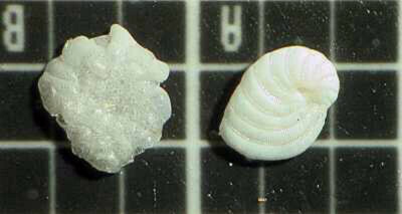 Forams can be mounted on paleo-slides against a black background for observation with a stereo microscope. This image was taken from a slide prepared by Brian Darnton.